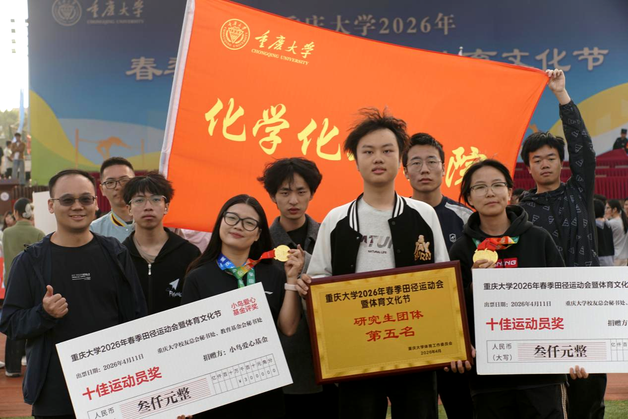 2026年重庆大学春季田径运动会于4月11日圆满落幕。化学化工学院学子团结协作、奋勇争先,最终荣获研究生团体第五名的优异成绩。